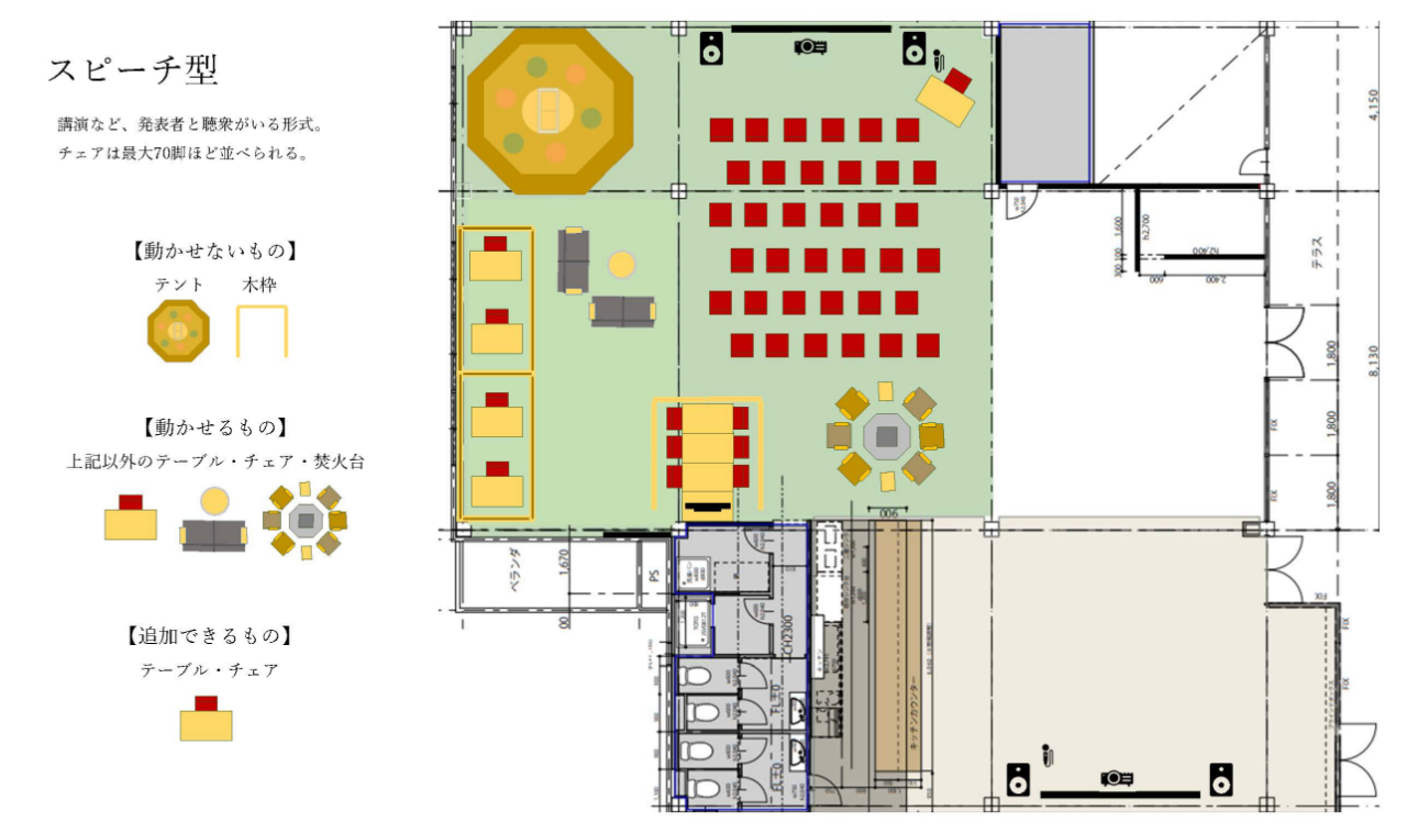スタッフへご相談ください。変更する場合は、ご自身での会場準備/原状復帰をお願いしております。